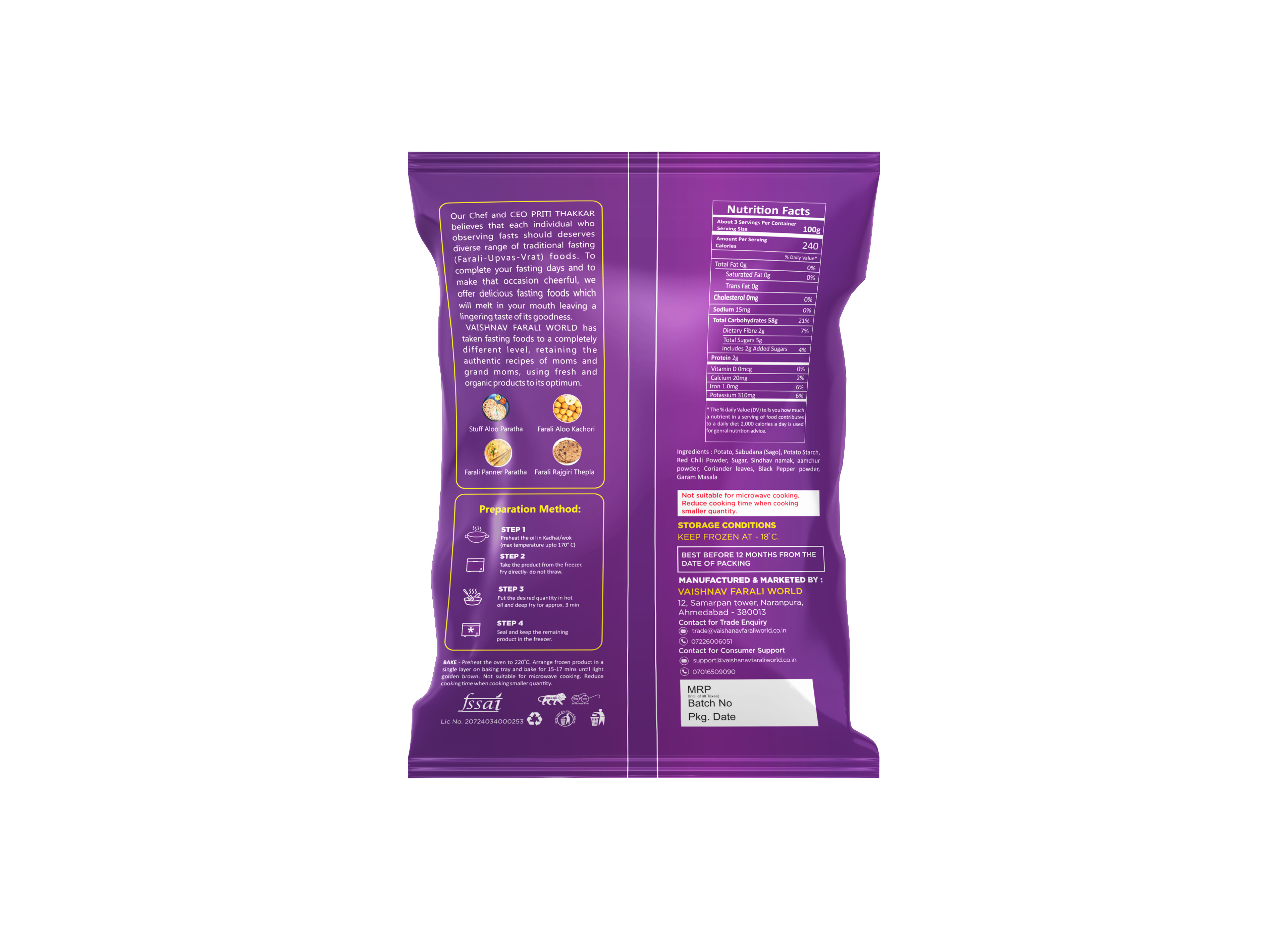 • Also try our other FARALI ready to eat food range like Farali Aloo Sukhi Bhaji, Sabudana Khichdi, Farali kadhi, Farali aloo sabji with gravy, Farali Dahi Curry, Farali Plain Samo, Farali Paneer Sabji etc.